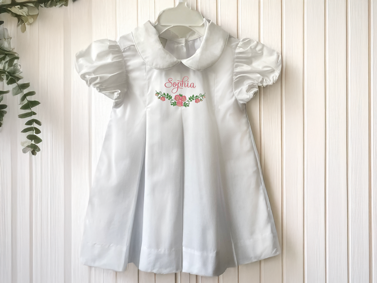 This heirloom-quality white dress features a Peter Pan collar, puff sleeves, and crisp pleats for a timeless silhouette. Embroidered with your child’s name inside a delicate rose design, it’s the perfect outfit for birthdays, Easter celebrations, baptisms, flower girl dresses, and other cherished family occasions.