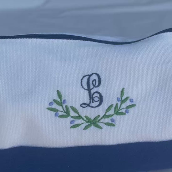Keep your smallest essentials organized in timeless style. This petite navy and ivory makeup bag features a beautifully embroidered monogram framed by a delicate greenery wreath and bow — a signature Smith Harbor design.