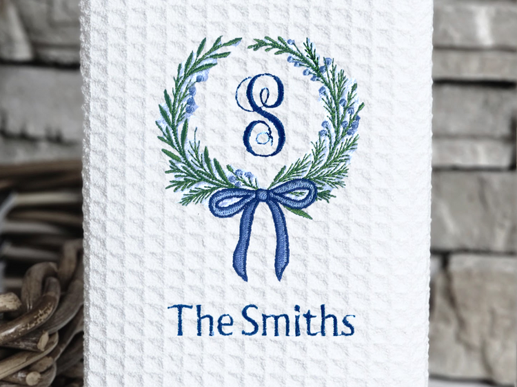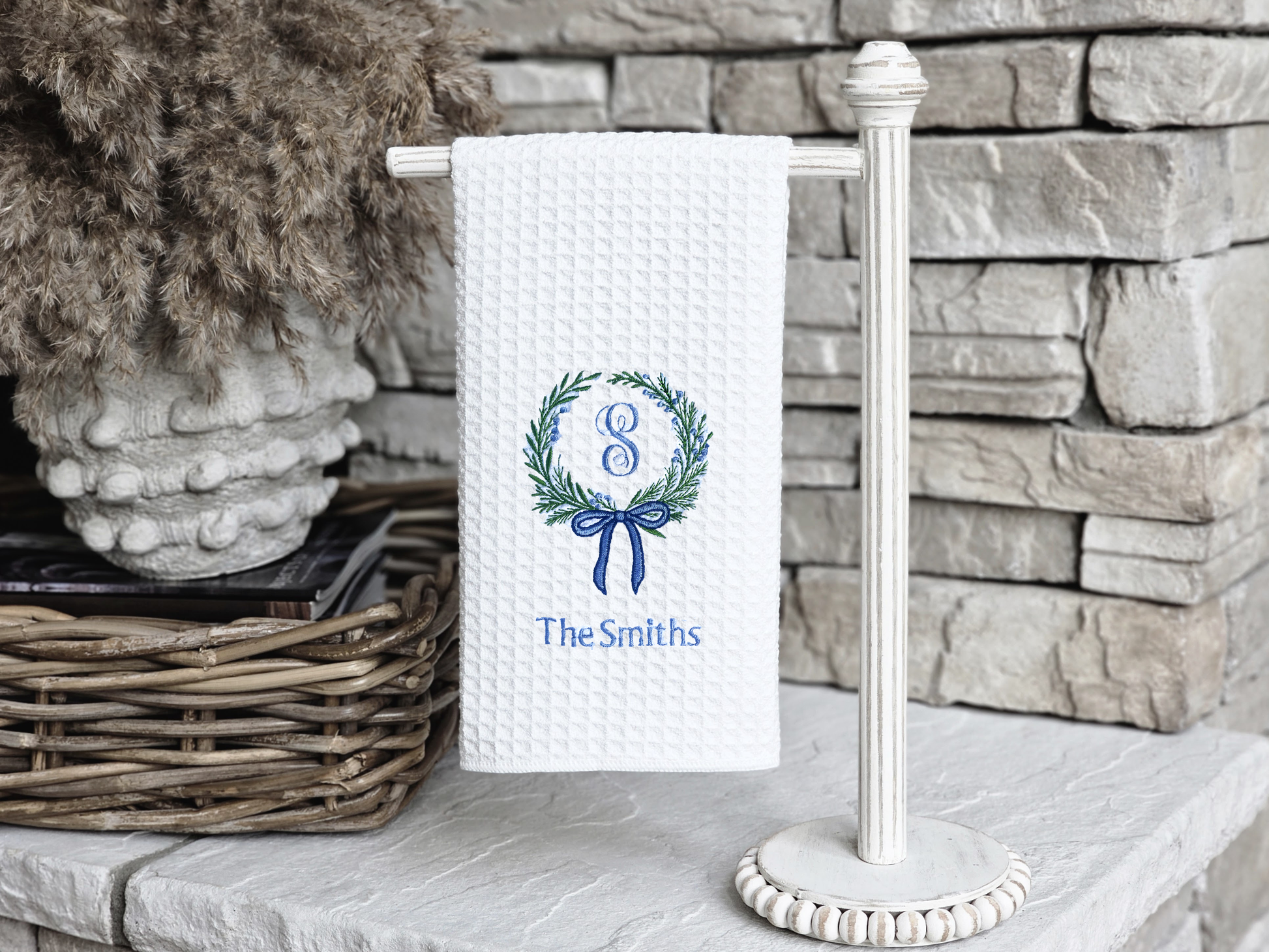 Add a timeless, personalized touch to your kitchen or gift basket with this embroidered waffle weave towel. Featuring a classic laurel wreath with a monogrammed initial and the family’s last name, this towel is a meaningful keepsake for weddings, housewarmings, anniversaries, or simply celebrating family.